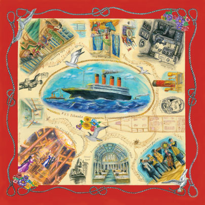 This is in the style of the travel souvenir scarf. It portrays the glamour of the beautiful but ill fated ship, RMS Titanic. The requested melodies that the band played during the voyage, flow throughout this silk scarf.